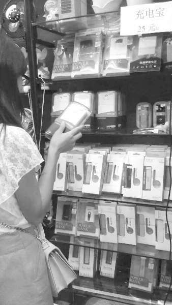 记者看到解放西路一家主营小饰品的小店在销售各种移动电源。和专卖店相比,这里的移动电源价格较便宜,店家打出“移动电源,25元起”的促销牌。记者拿起一标价38元的移动电源,包装上都是英文。