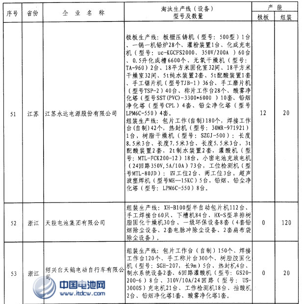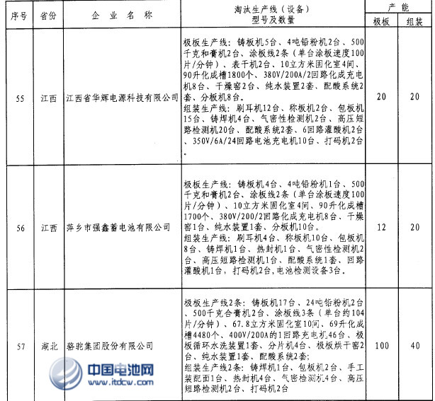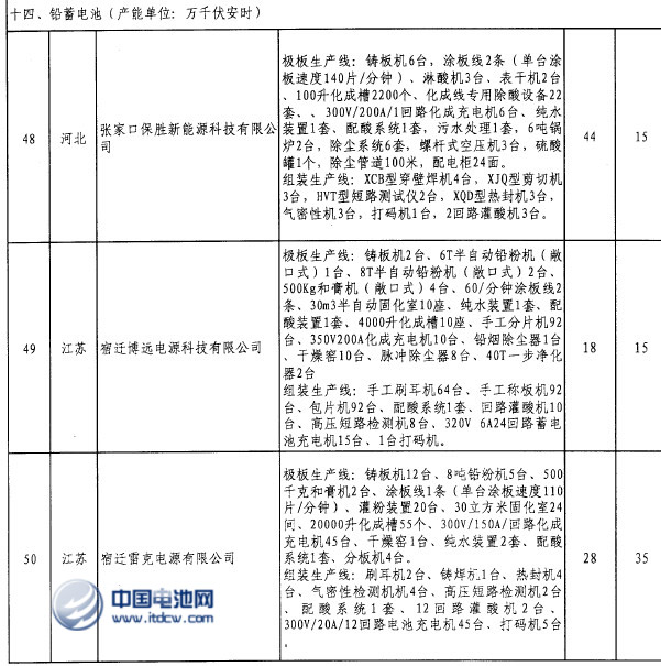 中国电池杂志-中国电池网9月17日讯(肖何 北京报道)工信部网站发布2013年第46号公告2013年第三批工业行业淘汰落后产能企业名单,铅蓄电池行业有11家赫然上榜,分别是张家口保胜新能源科技有限公司、宿迁博远电源科技有限公司、宿迁雷克电源有限公司、江苏永达电源股份有限公司、天能电池集团有限公司、绍兴白天鹅电动自行车有限公司、泗县惠丰电源有限公司、江西省华辉电源科技有限公司、萍乡市强鑫蓄电池有限公司、骆驼集团股份有限公司、福建省闽华电源股份有限公司(安溪县),其中极板生产线(设备)629条,组装生产线(设备)311条。