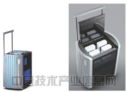 在东京车展上展示了作为可搬运发电机使用的燃料电池系统“FC Dock”(左)。在燃料瓶中填充水合肼,安装到系统上使用(右)