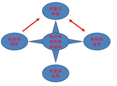 一图详解电动车车身结构与安全性的关系:因低速电动车电池能源有限,要提高电源利用率,势必采用轻量化车身,而轻量化与车身安全的关系是一个矛盾;另外就是是电动车中如何保证碰撞中的电源安全问题。
