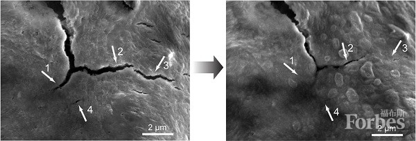 大家可以通过下面的照片,观察这一过程在电子显微镜下的表现。在左图中,硅电极出现了裂缝;但几小时后,其中几条裂缝就已经愈合。
