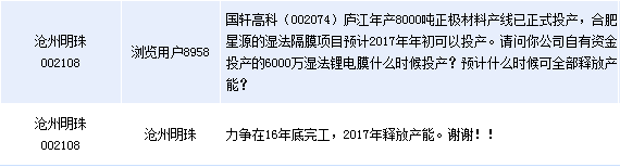 沧州明珠(002108)周二在全景网互动平台上表示,公司6000万湿法锂电膜项目力争在16年底完工,2017年释放产能。