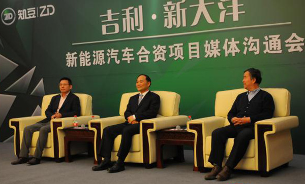 2015年1月10日吉利与新大洋成立知豆合资公司发布会上,新大洋集团董事长鲍文光(左)吉利集团董事长李书福(中)清华大学汽车系教授陈全世(右)在台上接受记者问答)