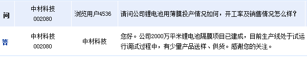 中材科技(002080)周五在全景网互动平台上表示,公司2000万平米锂电池隔膜项目已建成,目前生产线处于试运行调试过程中,有少量产品送样、供货。