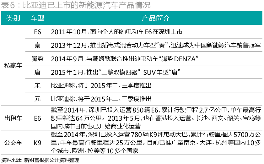 产品方面,比亚迪实施“7+4”布局,使新能源车型覆盖7个主要目标市场(私家车、公交车、出租车、环卫车、城际间客运车、物流轻卡车、建筑工程车)及4个特种车市场(仓储、机场、矿山、港口的专用车辆),实现对交通运输工具的全面覆盖。截至目前,比亚迪已在私家车、公交车、出租车三个领域推出6款新能源汽车产品(表6)。