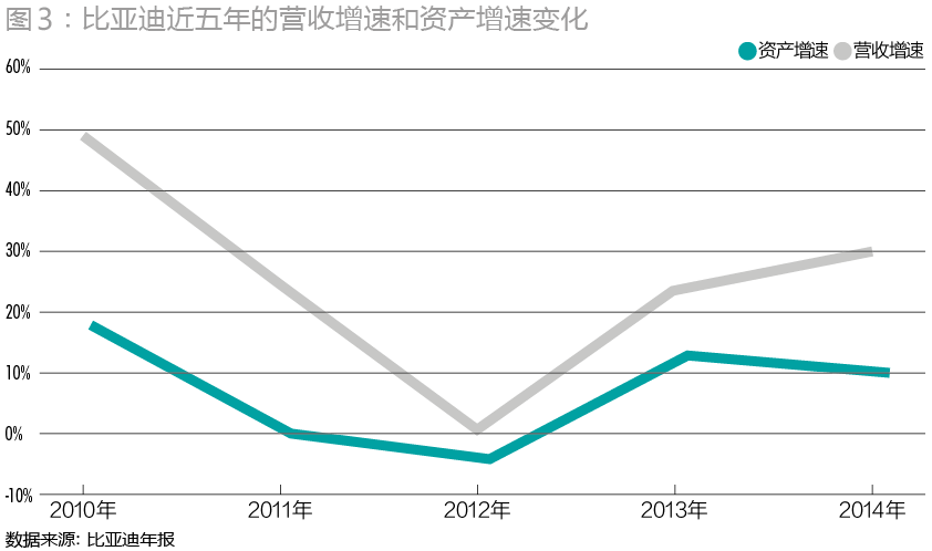 2011年比亚迪先后三次融资,获得54.2亿元资金。尽管在A股IPO的实际募资比预期额度21.92亿元少7.7亿元,但已是当时最后的融资机会。比亚迪2010年在汽车市场马失前蹄,但是当年的营收增速依然达到17.84%,加之2009年48.28%、2008年30.72%的营收增速,为其顺利融资留有机会。但2011年、2012年的经营情况继续恶化,营收增速分别降至0.78%、-4.4%,直接反映在当年的财报数据上。上述融资项目如再推迟半年,王传福的如意算盘只怕要落空。