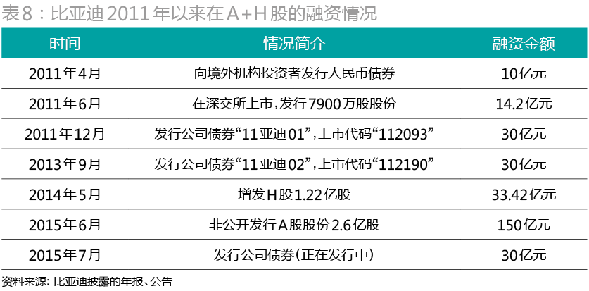 2011以来,比亚迪通过股票IPO和发行公司债券,在A股及H股资本市场上募集资金近300亿元(表8)。上述融资项目的顺利完成,得益于王传福巧妙利用时机。