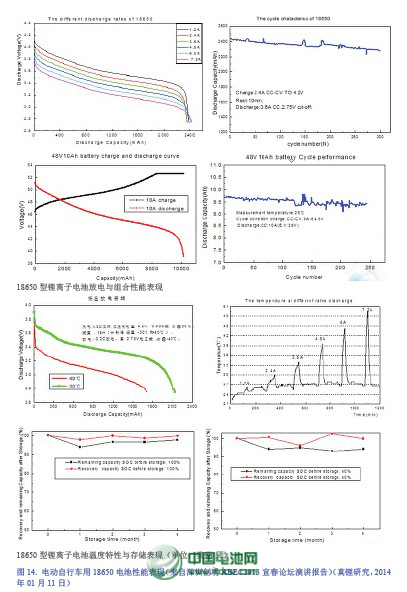 深圳创明是从电池的性能和价格等角度判断电动自行车将会发展成为18650 电池的一个最主要的应用市场,该公司演讲报告中列出的18650 电池放电与组合性能表现图、18650电池温度特性与存储表现图见下图14。同时,该公司还认为18650 电池将会在电动汽车领域取得好成绩。