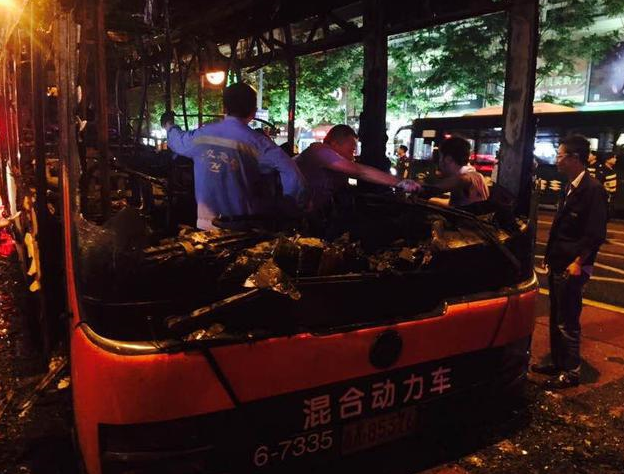 杭州闹市区一辆混合动力公交车起火 致9人受伤