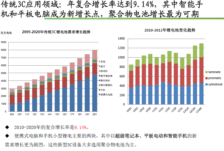 2010-2020年的复合增长率是9.14%。 便携式电脑和手机小型锂电主要的两块,其中以超级笔记本、平板电动和智能手机的新需求增长更为剧烈,这些新型3C设备大多选用聚合物电池为主。...