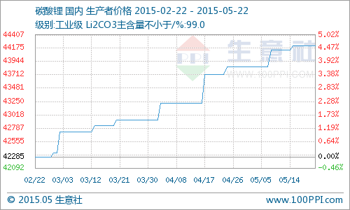 5月国内工业级碳酸锂行情阶梯状上扬 同比去年上涨15.47%