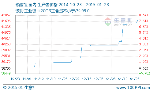 碳酸锂价格自2015年1月上旬上调500元/吨后,河南、四川、江西等地多家企业1月23日再次上调报价,工业级碳酸锂价格上调300-2000元/吨,电池级碳酸锂亦涨1000元/吨报46000元/吨。...
