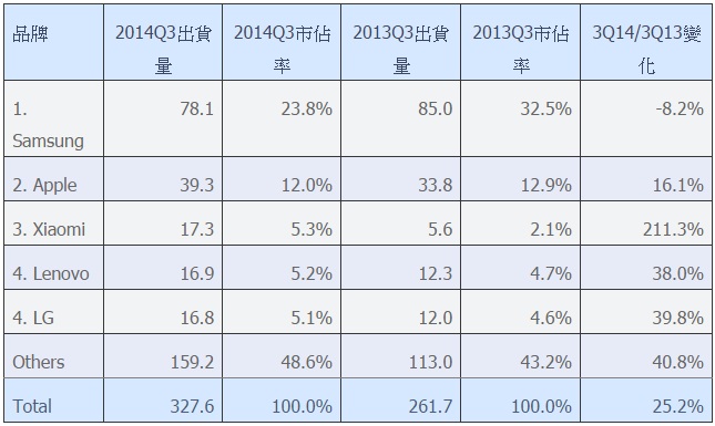 全球智能手机出货量超3亿部 小米跃居第三