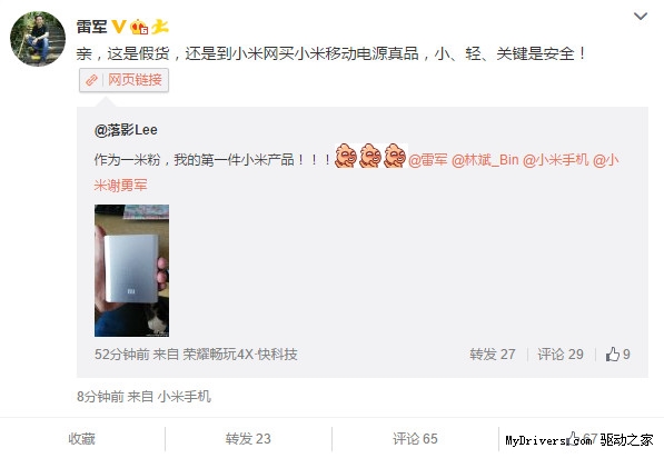 米粉晒小米移动电源 雷军:亲 这是假货