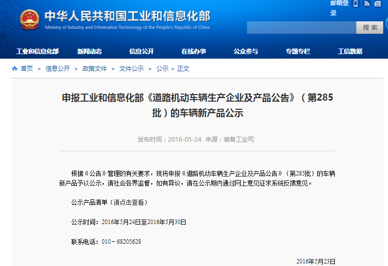 根据《公告》管理的有关要求,现将申报《道路机动车辆生产企业及产品公告》(第285批)的车辆新产品予以公示,请社会各界监督,如有异议,请在公示期内通过网上意见征求系统反馈意见。...