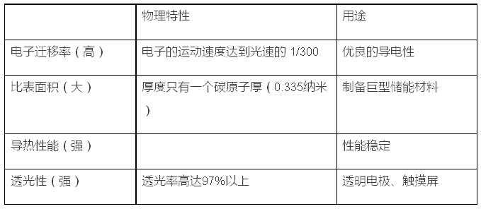 表1 石墨烯材料的物理特性及用途