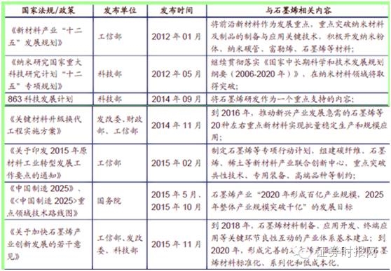 《中国制造2025》明确了石墨烯发展目标,文件指出到2020年“规模制备及电化学储能、印刷电子、航空航天用轻质高强复合材料、海洋工程防腐等应用领域的技术水平达国际领先,大幅提升相关产品性能,形成百亿元产业规模。到2025 年突破石墨烯在电子信息领域应用的技术瓶颈,整体产业规模突破千亿。”