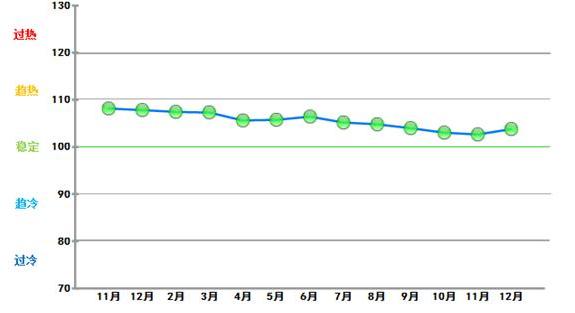 12月份中轻景气指数为103.81,位于“稳定”区域,体现了当前我国轻工业整体发展较为平稳的状态(参见图1-1)。与11月相比,中轻景气指数回升1.15。