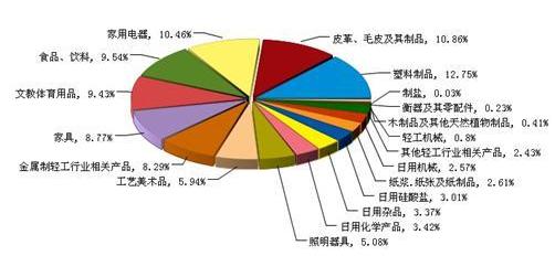 2011年,塑料制品,皮革、毛皮及其制品,家用电器仍为出口额较大的行业,分别占到全部出口额的的12.75%、10.86%和10.46%。从同比增速来看,工艺美术品,制盐,纸浆、纸张及纸制品三个行业的出口额增速较快。