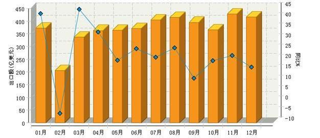 2011年1~12月,全国轻工全行业累计完成出口额4,431.14亿美元,同比增长22.95%。其中12月份完成出口额415.41亿美元,同比增长16.83%。