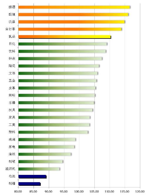 从分行业运行指数来看,在重点监测的25个行业中,有9个行业景气指数下降,其中制糖行业景气指数下降明显。16个行业景气指数上升,眼镜、陶瓷行业上升明显。其中酿酒、眼镜、洗涤、自行车、乳品五个行业仍然处于趋热区间,电池行业和制糖行业处于趋冷区间。