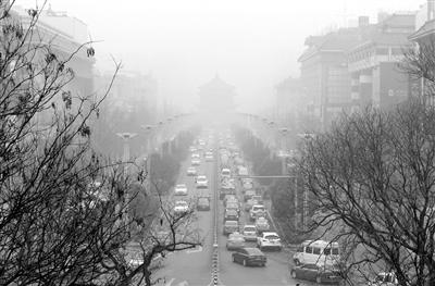 图为西安钟楼在雾霾中若隐若现。