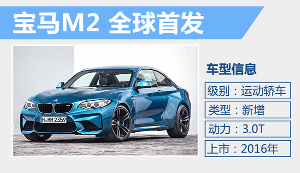 宝马M2在刚刚开幕的北美车展中正式发布,新车作为1系M Coupe的继任车型,将担任起宝马M系列的入门版高性能轿跑车的角色。据了解,新车将在今年4月的北京车展上正式引入国内。全新宝马M2搭载了一台3.0L V6双涡轮增压发动机,最大功率268千瓦,最大扭矩为464牛米。匹配6速手动变速箱的车型能够在4.4秒内完成百公里加速,而匹配双离合变速箱的车款则能将加速用时压缩至4.2秒。