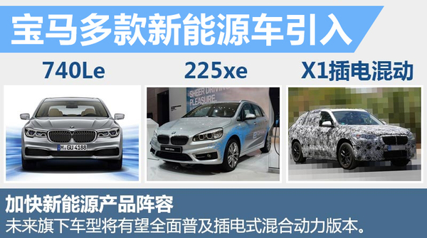 插电式混合动力等新能源类型车辆将会成为宝马明年车型投放的重点。此前宝马全新一代7系、2系Active Tourer、全新M3已相继推出,随后全新7系入门版730Li和740Le插电混动版车型也将有望引入国内。按照宝马的产品规划,未来将不断完善新能源产品阵容,旗下的车型也将全面普及插电式混合动力版本。随后,2系插电混动车、3系插电混动车以及X1插电混动车都将有望在年内引入国内。
