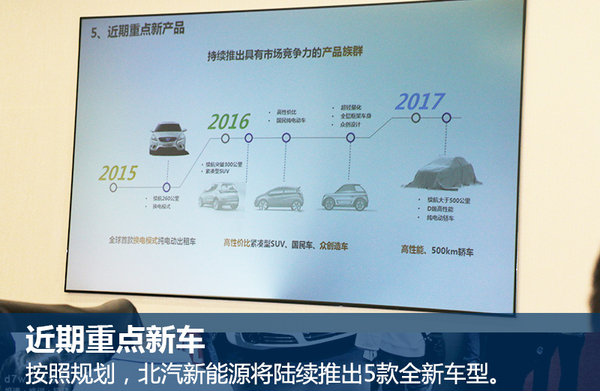 北汽新能源将推出5款全新车型,其中纯电动A级车EU260(续航里程260公里)将于2-3月正式上市,接下来纯电动A0级SUV—EX200(续航200公里)将于3-4月登陆市场,其后续推出的高里程版续航可达到300公里。在今年的9-10月份,旗下全新A00级“国民车”将上市,该车将进一步拉低入门售价;今年年底,全新“众创”品牌旗下车型将上市,进一步丰富产品阵容。2017年,北汽新能源将推出全新D级高性能纯电动轿车,其续航里程将超过500公里。