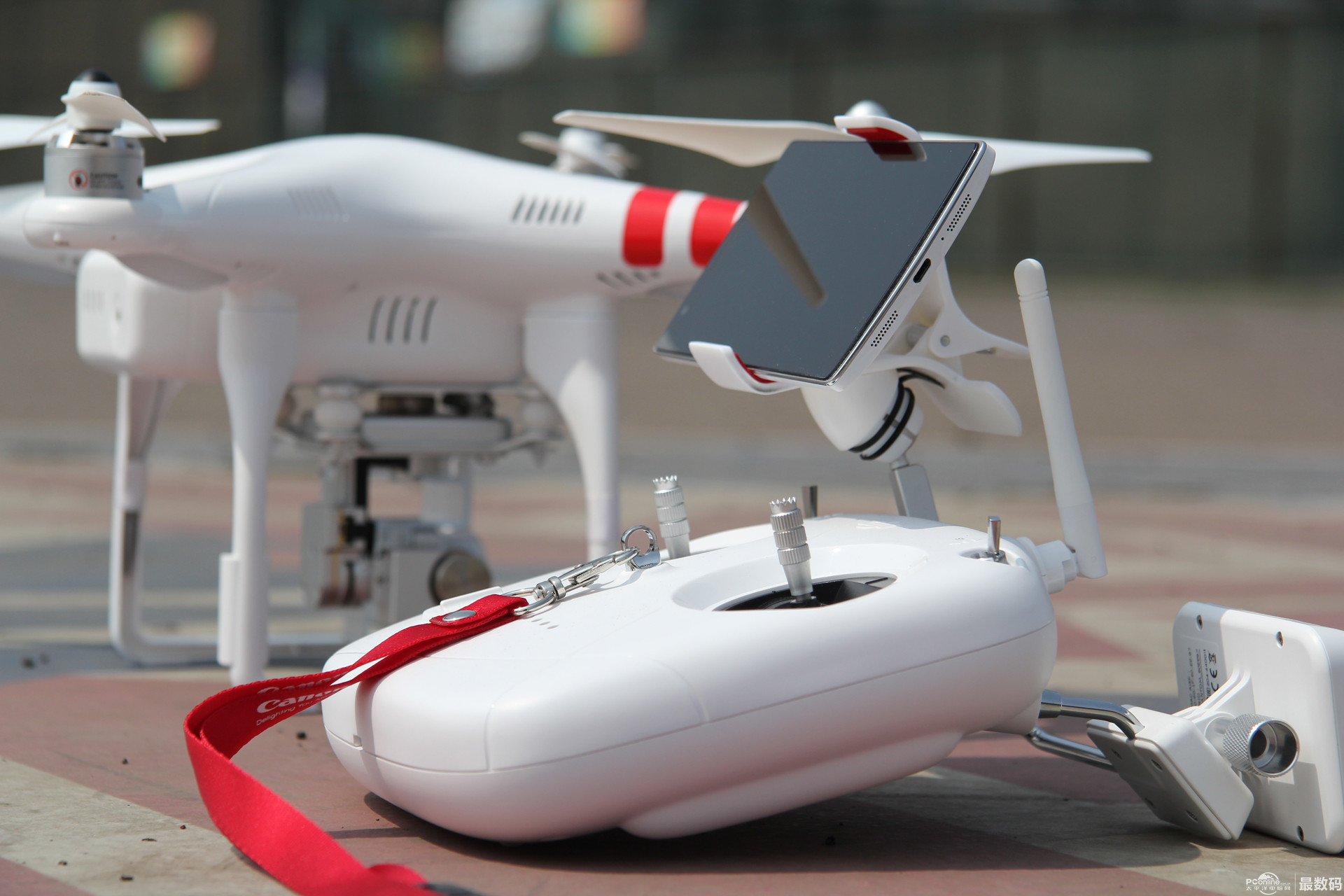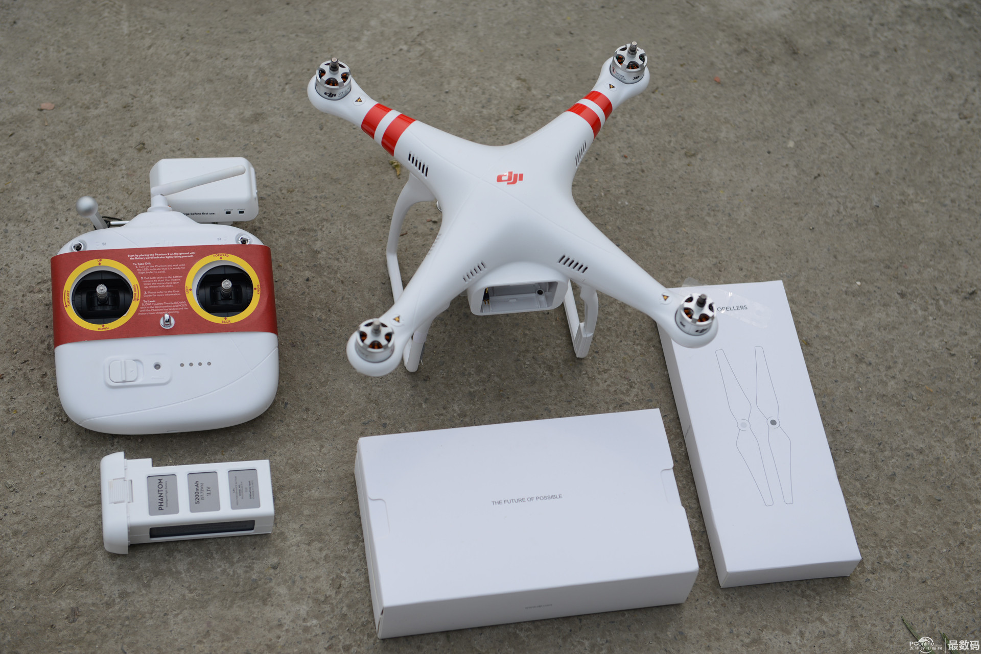 Phantom2Vision+机身、新款遥控器、电池、桨(盒子里)、电源适配器(盒子里),说明书、数据线等 左摇杆上下推是升降,左右推是横滚;右摇杆就是操控