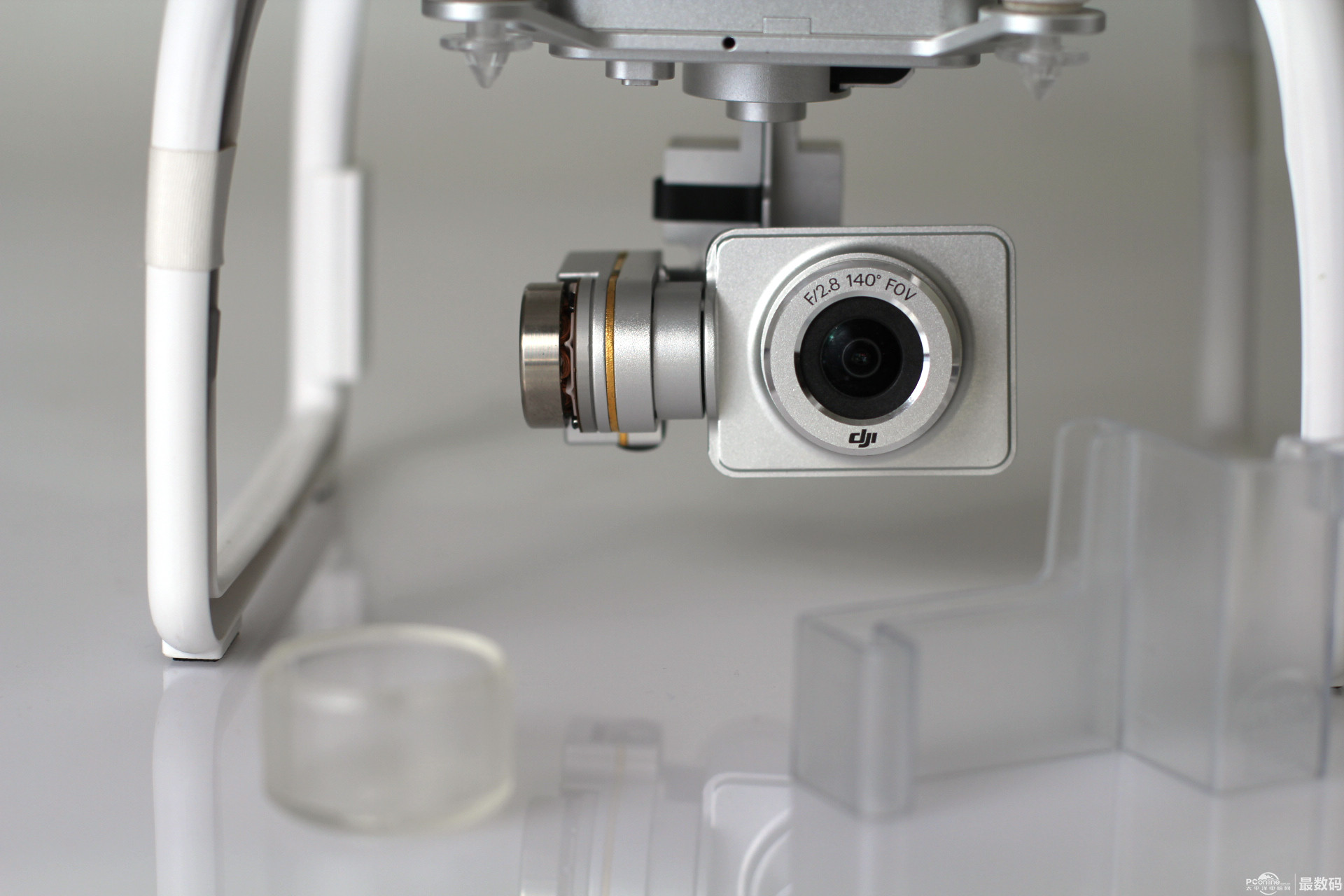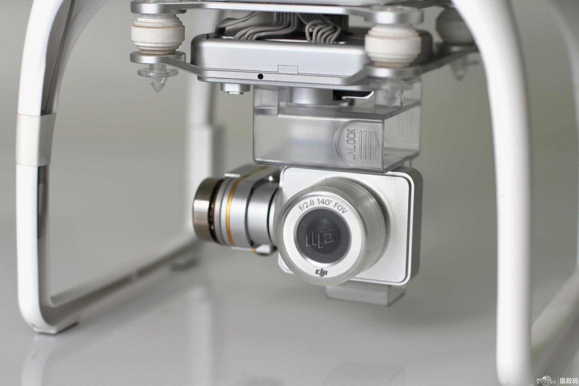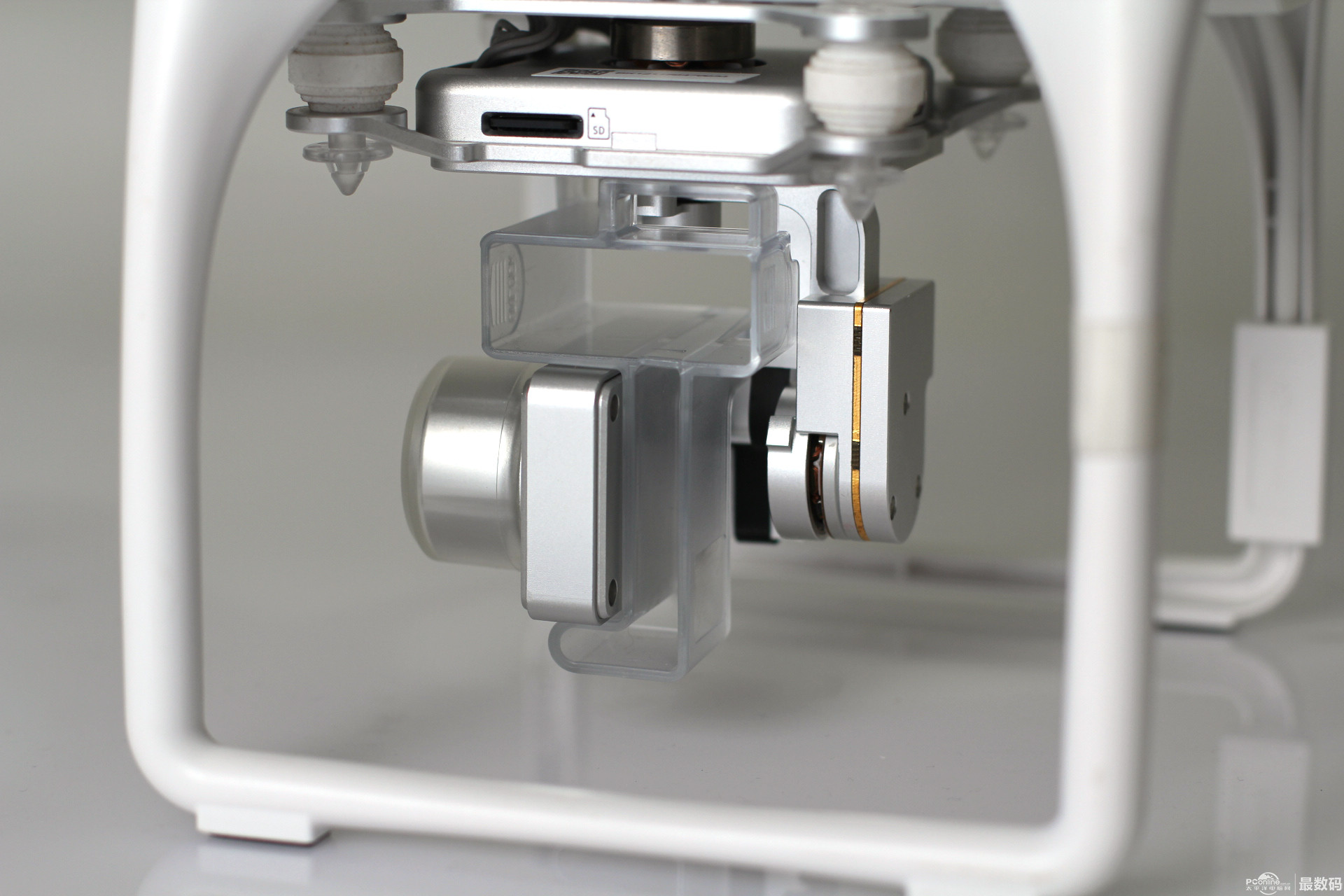 起落架上有防静电指南针 有tf存储卡插口 led飞行指示灯。红灯表示机头,绿灯表示机尾。 起落架有黑色脚垫 取下云台保护锁扣和镜头盖