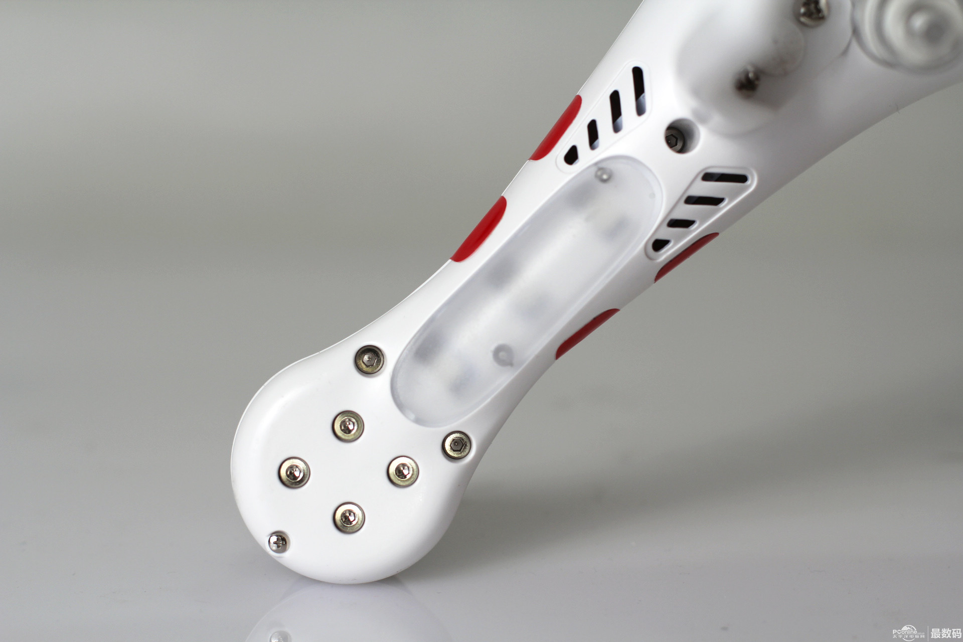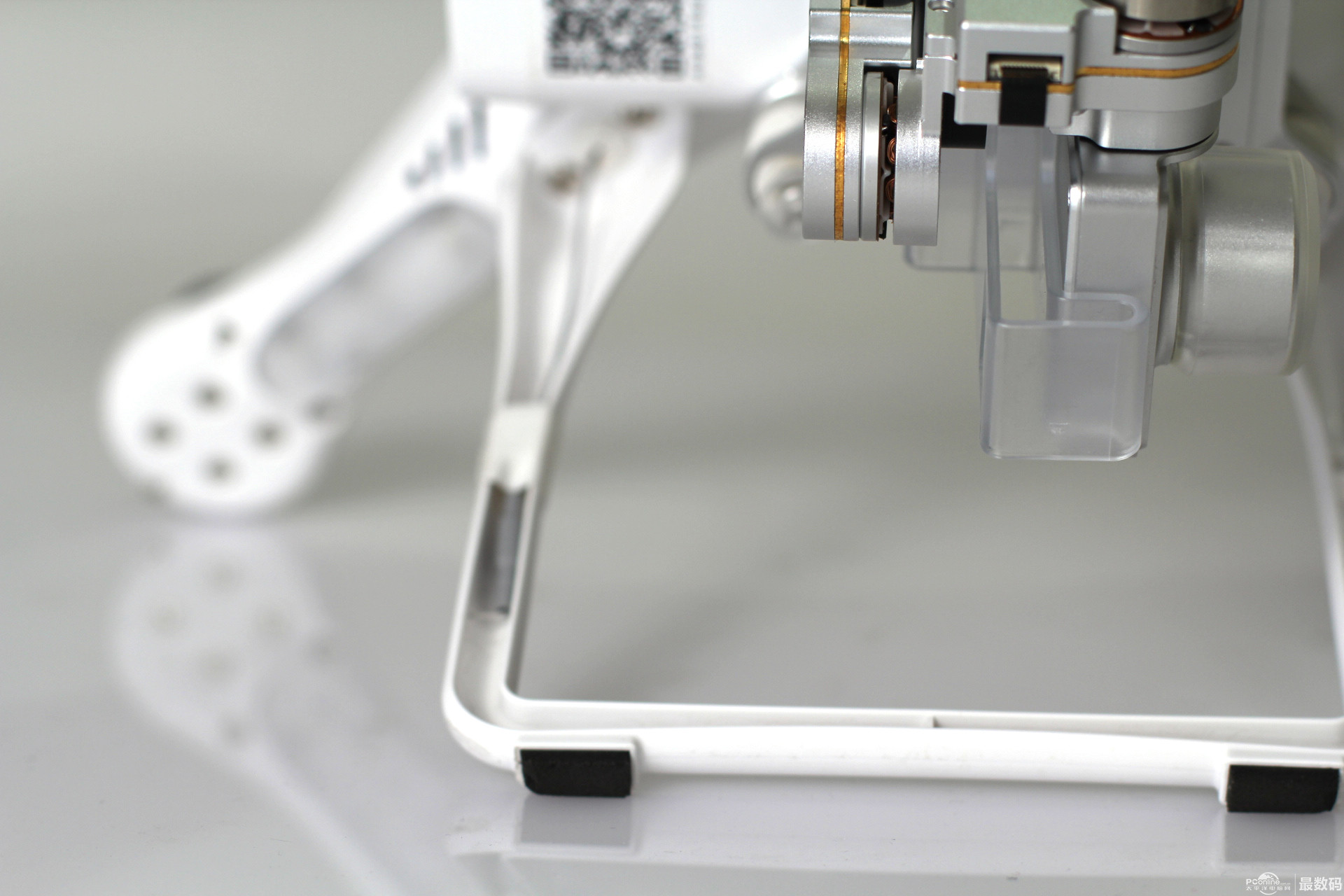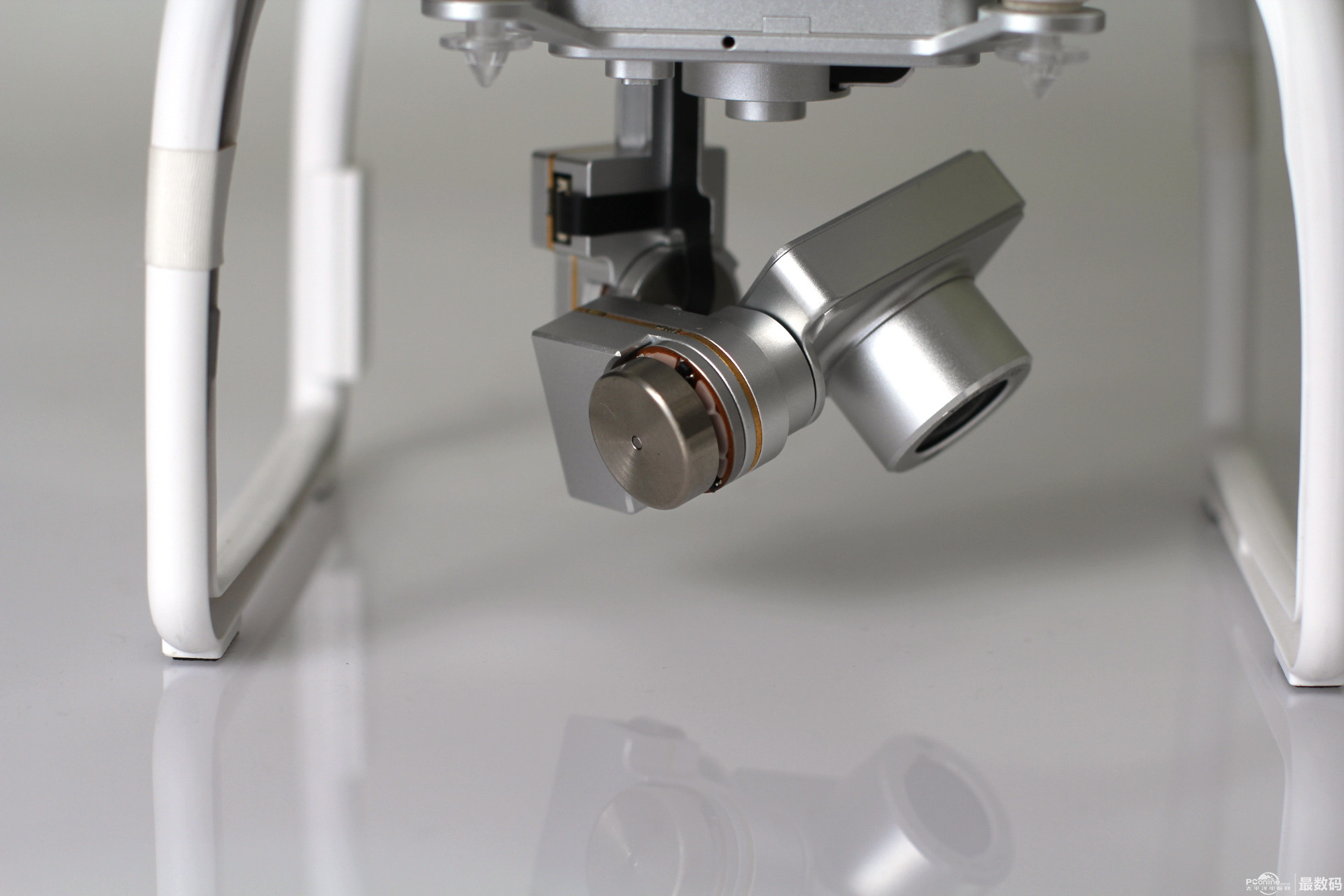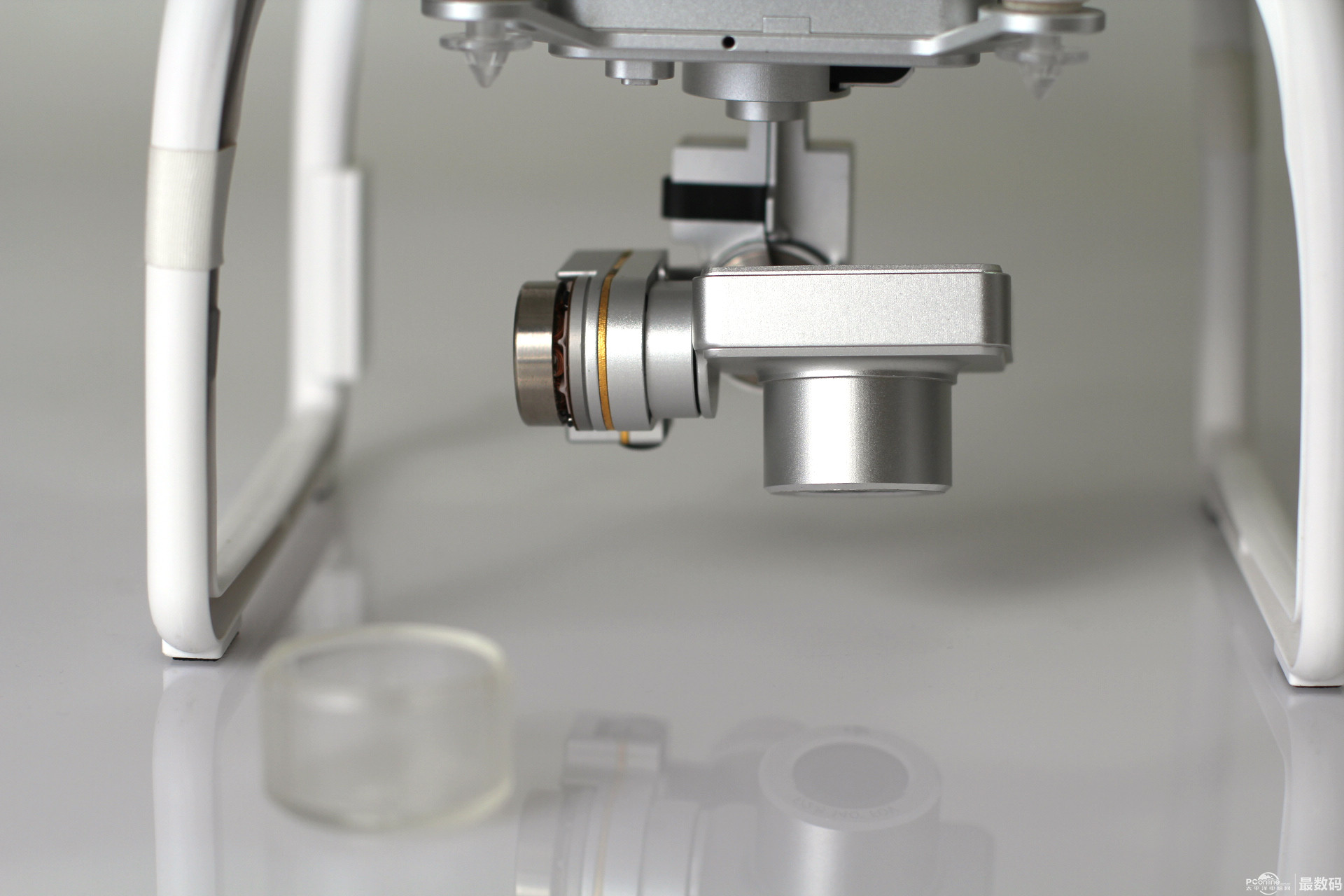 起落架上有防静电指南针 有tf存储卡插口 led飞行指示灯。红灯表示机头,绿灯表示机尾。 起落架有黑色脚垫 取下云台保护锁扣和镜头盖