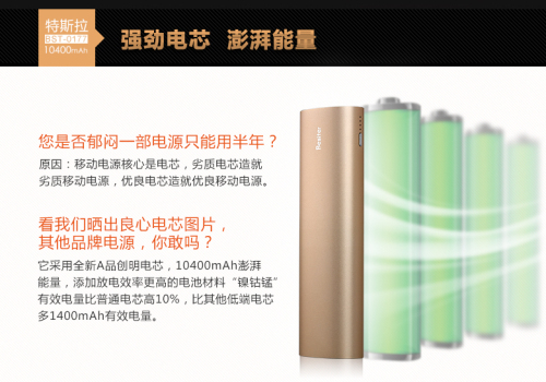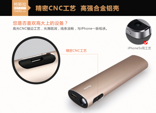耗时2年对行业的深度解析,全网扫描,全面超越,打造追求极致的电源之王。它,就是移动电源中的特斯拉!强劲A品创明电芯,航空铝材合金外壳,精密CNC工艺处理,2.1A极速充放电技术,专业手电筒级别10米超远强光射灯,成就特斯拉移动电源的完美品质。