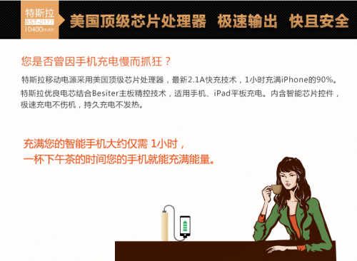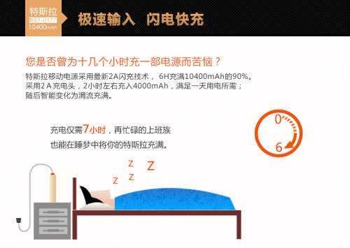 特斯拉移动电源采用最新2A闪充技术, 6H充满10400毫安的90%,随后智能变化为涓流充满。Besiter特制充电头,2小时左右充入4000毫安,满足一天用电所需。