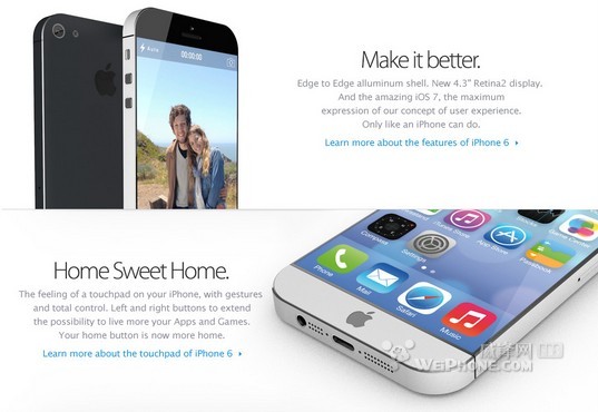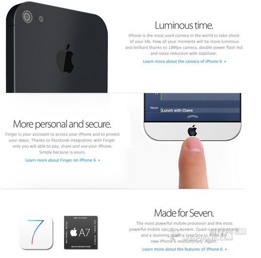 除此之外,iPhone 6 还将配备 1800 万像素摄像头、A7 处理芯片、双 LED 闪光灯、指纹扫描功能等。如果是谈到 2013 年的新款 iPhone,我们习惯称之为 iPhone 5S,也就是在 iPhone 5 的基础上做一些硬件的提升,同时添加一项杀手级别的软件功能。而对于假想中的 2014 年 iPhone 6 ,我们则期待去除 iPhone 4 影子的全新设计。