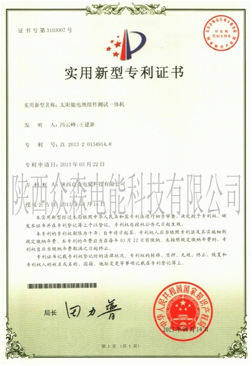 近日,陕西众森荣获了国家知识产权局颁发的实用新型专利证书。针对当前市场上对电池组件的主流测试方式仍采用不同仪器单独测试,而该专利将实现两种功能有效的结合,从而厂商可以利用组件测试一体机,能够同时满足测量太阳能电池组件的电性能与EL缺陷检测的要求,实现一次进料,一次接线,两种测试,既节约人力,提高生产效率,又节约场地。