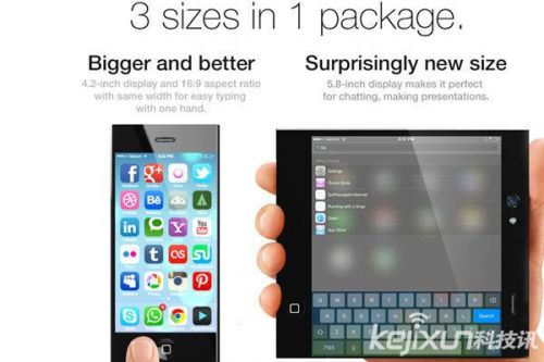 概念iPhone6带来革命性的改变,将iPhone、iPad合二为一。屏幕能够在4.2寸、5.8寸和7.5寸之间任意切换。4.2英寸显示屏,方便单手操作;5.8英寸显示屏,聊天、办公更加顺畅。