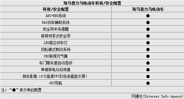 科技及安全配置是新车的一大亮点,据悉,新车将配备ABS+EBD系统、安全带未系提醒、车门随车速自动落锁、倒车影像、GPS导航等诸多功能配置,对整车科技感及舒适驾驶体验增色不少。其中配备的大尺寸液晶显示屏将提升行车安全性,并使诸多功能控制更加便捷。此外,海马普力马电动车还将配备电动后视镜,这也是日常驾驶较为常用的功能。