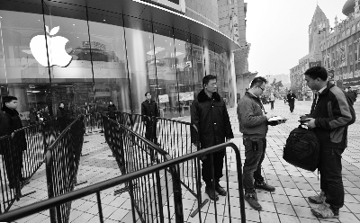 今天早上7点40分左右,记者来到北京王府井苹果店,此时店外只有六七名用户在排队,他们均表示是网上预订后前来店里取货的。上午8点苹果店开门后,工作人员表示暂时只接待网上预约取货的顾客,其他顾客需要等到10点苹果店正式开门后才可以进入。