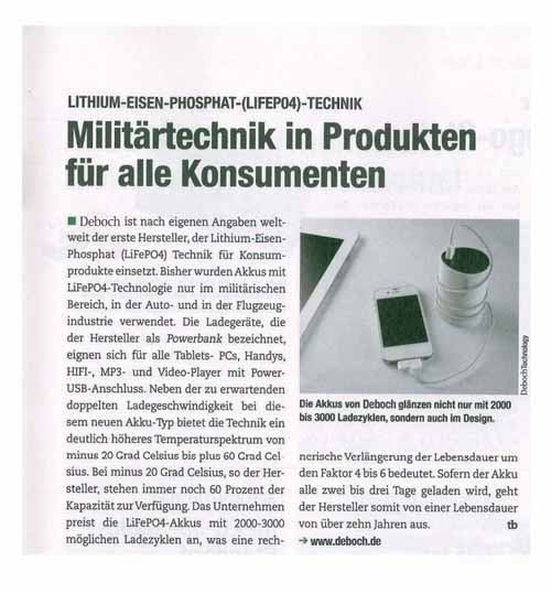 近日,德柏仕官方微博更新了一条消息:德文版《PCMagazin》杂志对磷酸铁锂技术进行深度报道,其中重点介绍了“DEBOCHX6000”的磷酸铁锂移动电源。德柏仕获得海外媒体关注,可谓是“墙内开花墙外香”,德柏仕品牌创办初期,围绕磷酸铁锂新能源的民用化推出了X系列和T系列产品,型号有X6000、X6000十五周年纪念版、X5000、T12000。在服务上,开创了3年免费换芯、百万保险和实标认证特色服务,这些新能源产品已经远销德国、中国台湾、中国香港、日本、东南亚等市场。