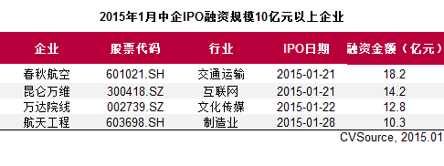 表1 2015年1月中企IPO融资规模10亿元以上企业
