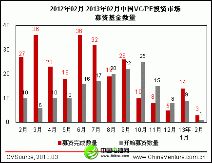 图1 2012年02月-2013年02月中国VC/PE投资市场募资基金数量