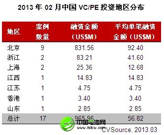 受春节假期影响,2013年2月份中国VC/PE市场活跃度出现明显下滑。募资方面,仅3支基金募资完成,募资金额仅为10亿元;投资方面,披露VC、PE投资案例共计17起,相比上个月下降50%;如不考虑京东商城7亿美元巨额融资案例,投资规模也同样大幅下滑。考虑到目前宏观经济回暖缓慢、A股及美股市场IPO窗口持续关闭,预计短期内VC/PE募资及投资活跃度均不会出现明显增长。