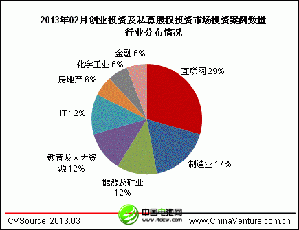 图5 2013年02月中国创业投资及私募股权投资案例数量行业分布情况