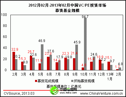 图2 2012年02月-2013年02月中国VC/PE投资市场募资基金规模