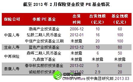 2月份一个值得关注的现象是保险资金的活跃。本月泰康人寿入股春华资本旗下人民币基金、宽带资本旗下诚柏基金,分别投资5亿元及2.9亿元。而此前已有中国人寿、生命人寿、中再保险等入股多支PE基金,保险资本投资PE步伐有望加快。