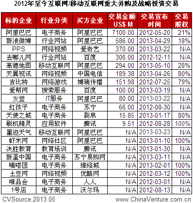 2013年初至今,与几近跌至冰点的IPO市场相比,并购市场频繁传出重大交易,互联网行业表现尤为突出,行业巨头纷纷展开多元化布局:3月22日,百度通过旗下视频公司爱奇艺以3.7亿美元收购全国最大的网络电视服务商PPS;3月23日,阿里巴巴收购手机客户端天气服务公司墨迹天气;4月29日,阿里巴巴以5.86亿美元收购新浪微博18%股份; 5月10日,手机地图服务商高德地图确认获得阿里巴巴集团2.94亿美元投资(见表1)。