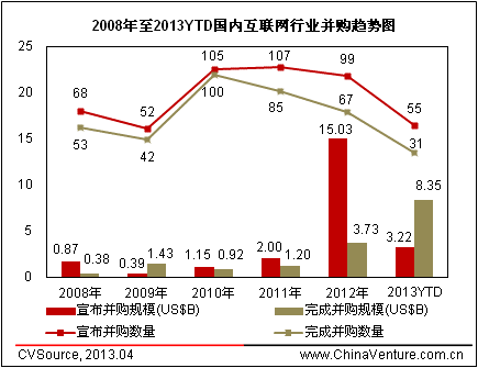 图1 2008年至2013YTD国内互联网行业并购趋势图