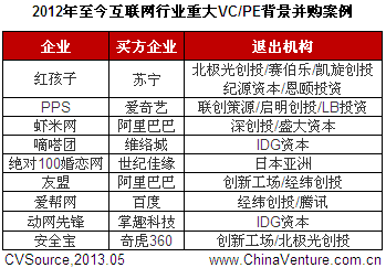 第三,自去年以来,中概股赴美上市窗口基本关闭,2011年下半年仅土豆网、2012年仅唯品会、欢聚时代实现IPO,今年暂无企业登陆美国资本市场。上市窗口受阻,大量的投资机构因基金面临存续到期迫切希望寻求多元化退出方式。根据ChinaVenture投中集团统计,2012年至今共有24家机构通过13笔互联网行业并购交易实现退出,虽然并购退出未能达到IPO退出的高额回报,却成为目前国内投资机构越来越青睐的退出方式(见表3)。