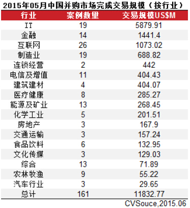 表3 2015年05月中国并购市场完成交易规模(按行业)